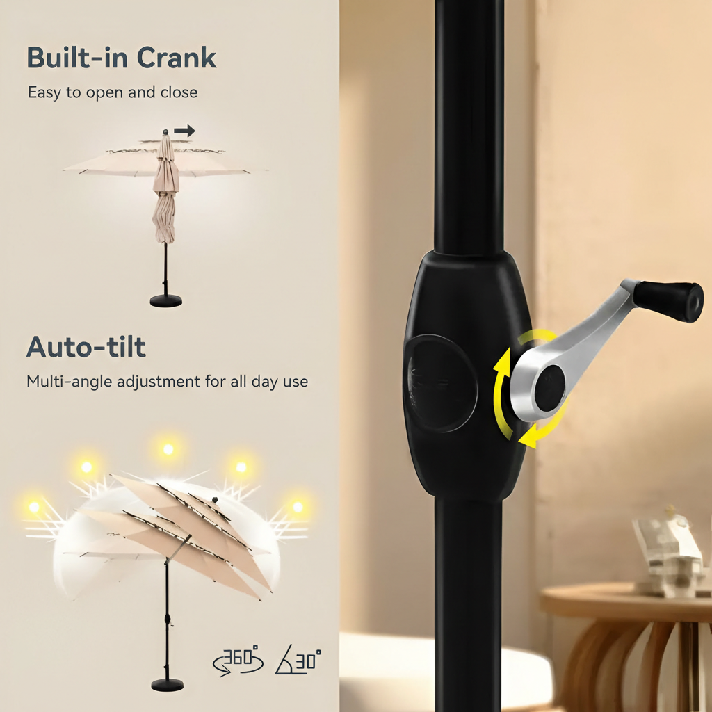 The 10FT 3 Tier Patio Umbrella is built with practical outdoor use in mind. Each structural element supports stability and controlled operation.