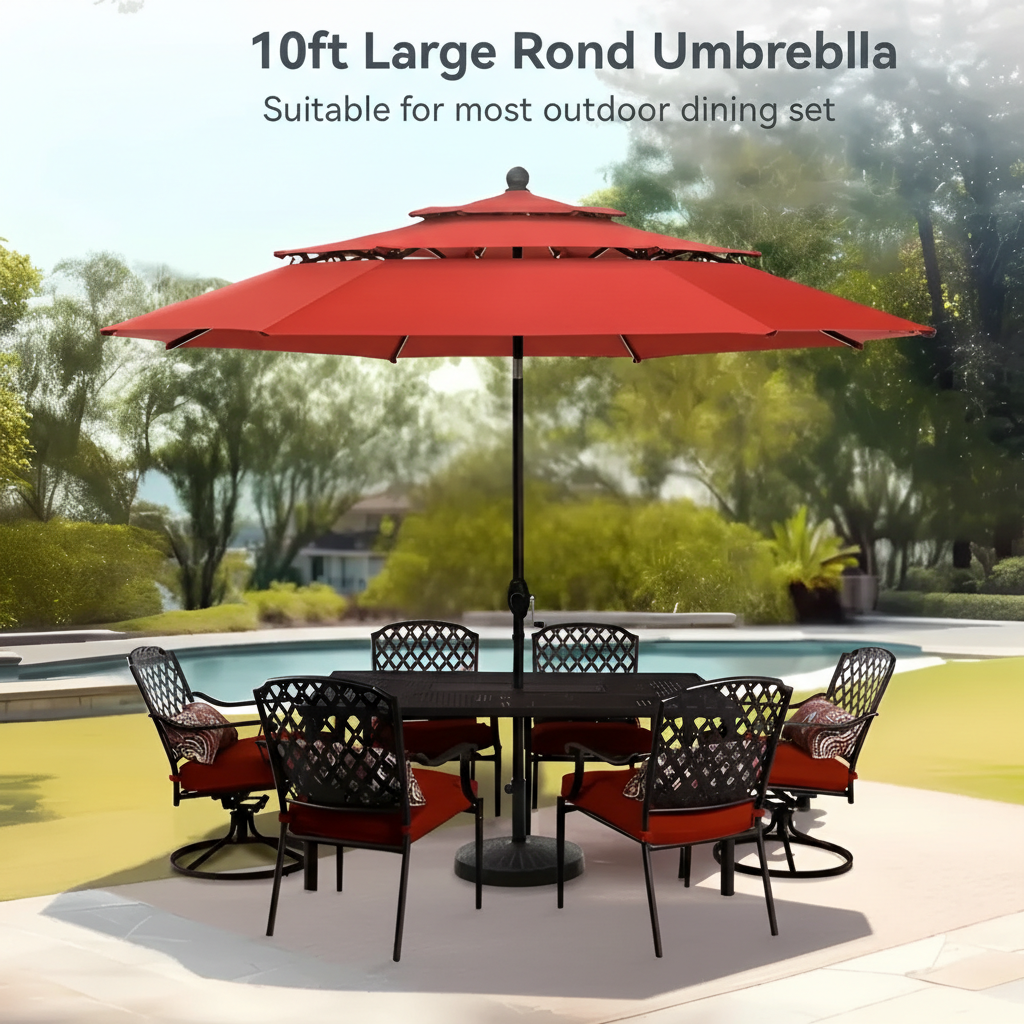 The 10FT 3 Tier Patio Umbrella delivers wide overhead coverage combined with airflow support and structured frame construction. Its crank lift system, tilt adjustment, and rotational capability provide practical positioning for changing daylight conditions.