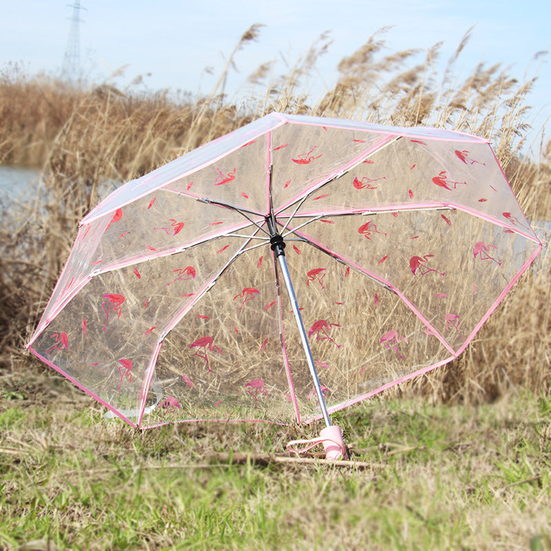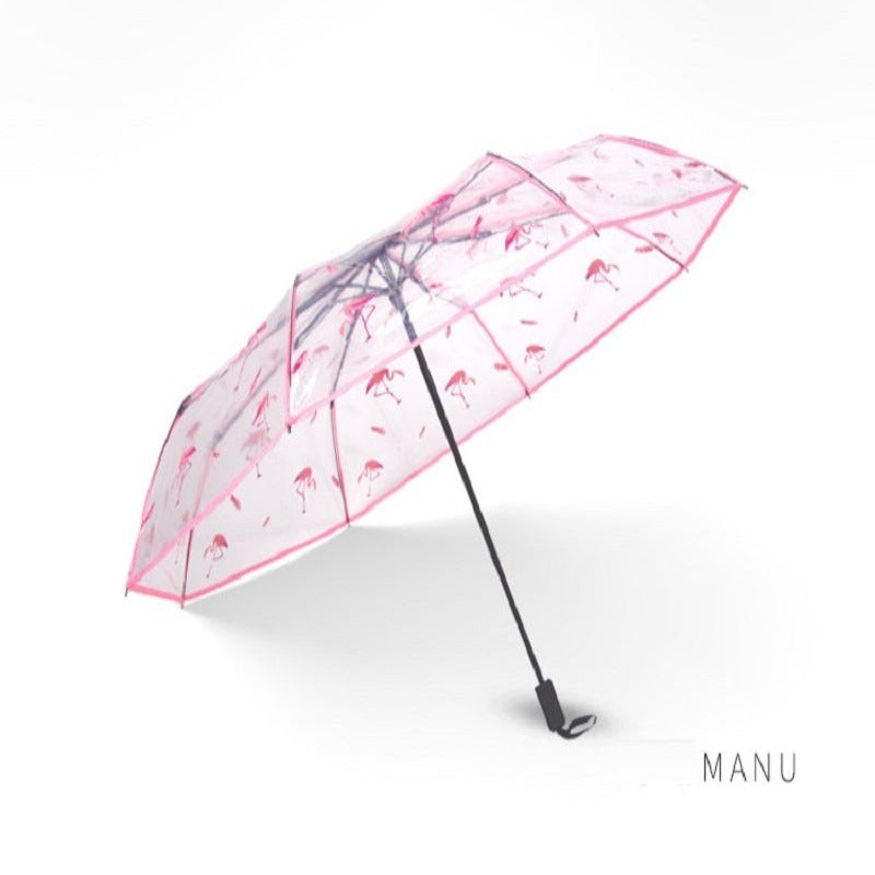 Flamingo Automatic Transparent Umbrella For Women are made from high-quality material and it has a transparent layer with a flamingo print on it. These are medium-sized and have a metal handle with an anti-grip and can be three-folded to make them easy to keep anywhere in less space. It has an anti-UV protection layer and is suitable for sunny and rainy days. It can be a great gift for women.