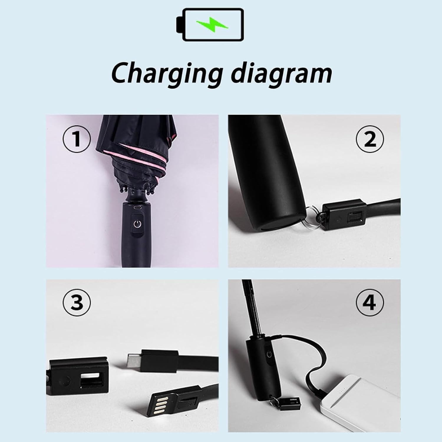 Convenient and Portable: USB rechargeable, this umbrella is easy to use anywhere. Its compact, lightweight design ensures effortless carrying and storage, perfect for the beach, park, or other outdoor settings.