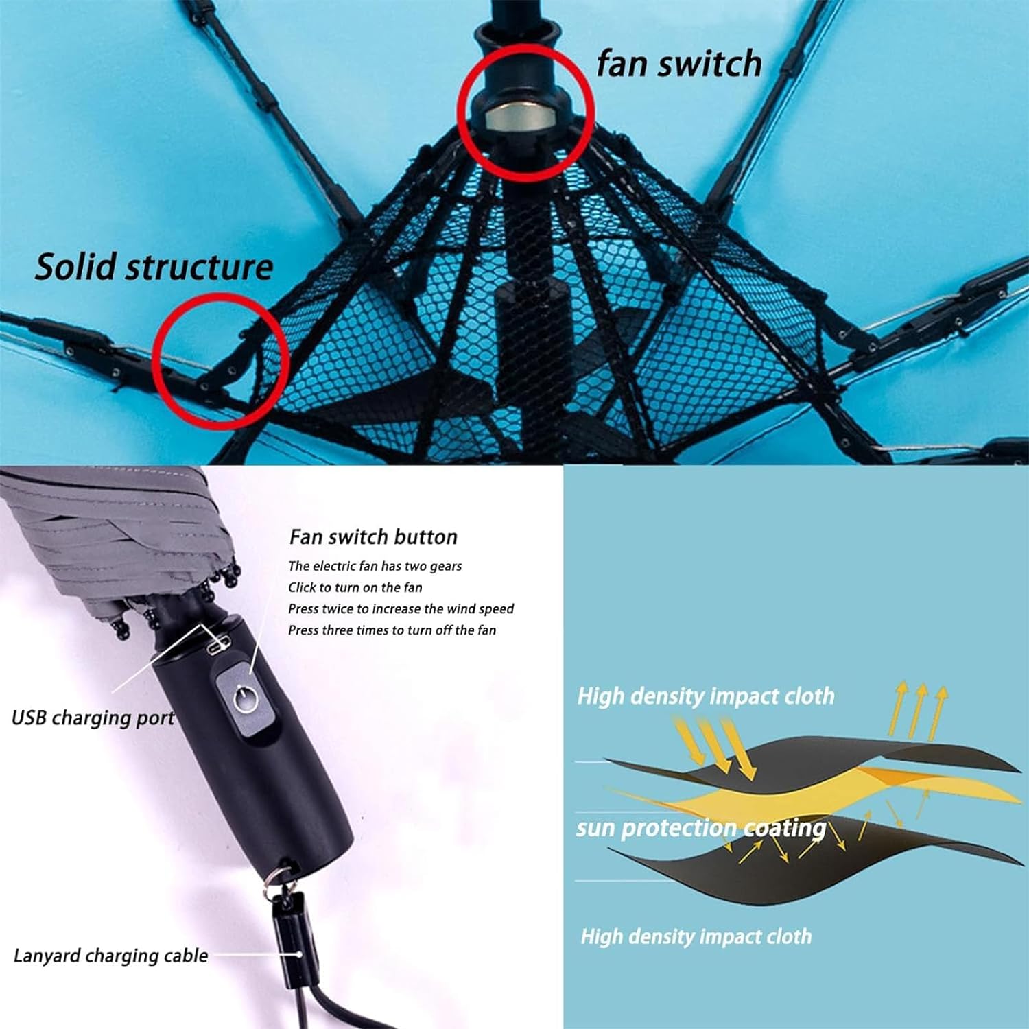 3-in-1 Portable Fan Umbrella: This umbrella features a small built-in fan, providing shade and a refreshing breeze. Experience cool comfort in the heat of summer.