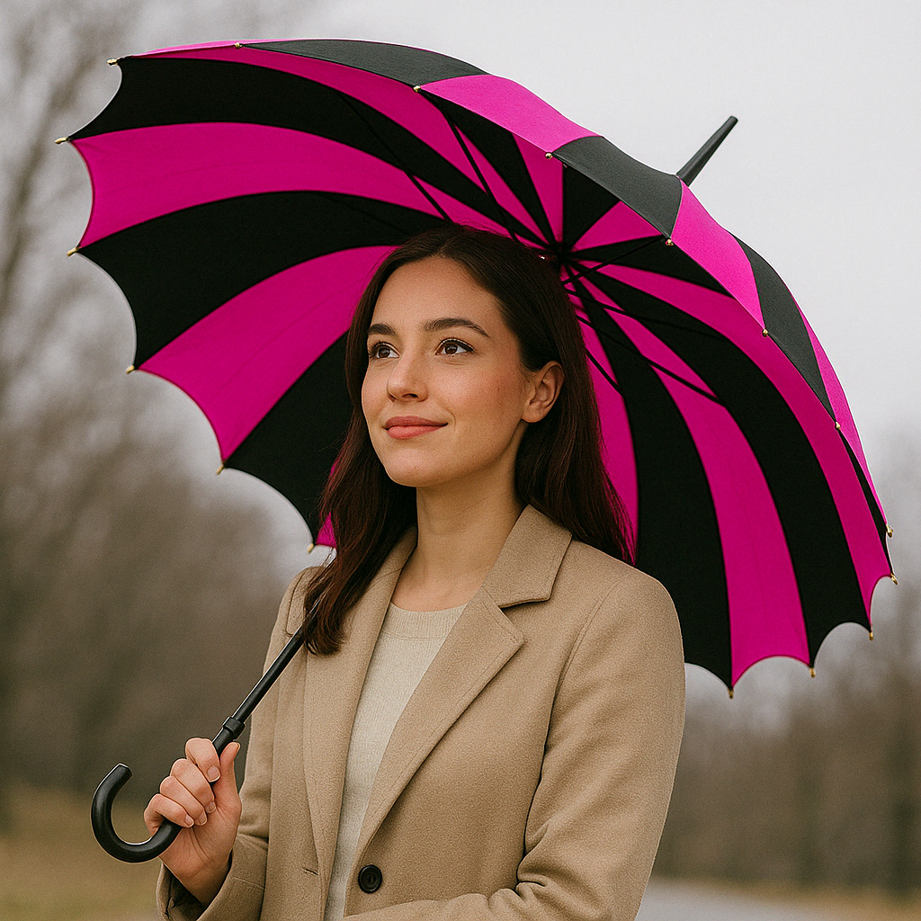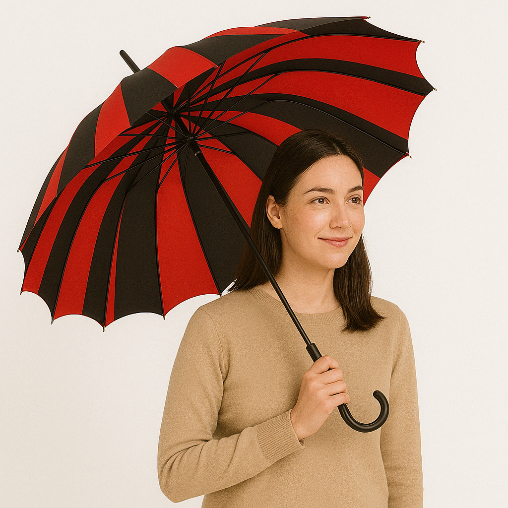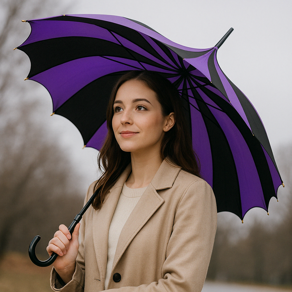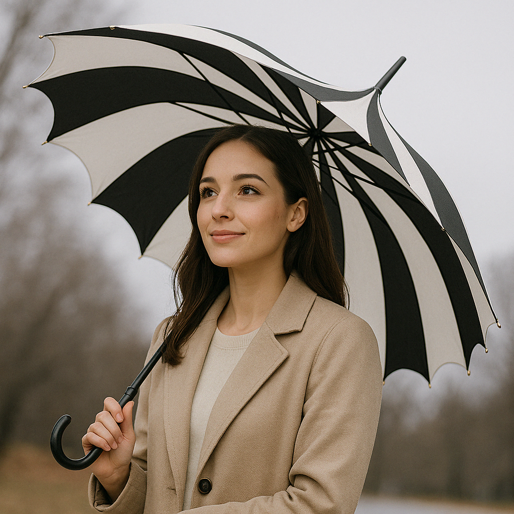 This Vintage Style Umbrella with a striped batwing pagoda canopy offers more than coverage—it offers character. With its layered silhouette, defined curves, and contrasting color pattern, it adds theatrical charm and practicality to your day. Designed for users who express identity through design, this umbrella enhances rain gear with storytelling and structure.