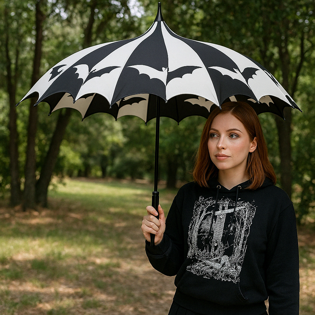 Running along the canopy are alternating black and white stripes, intersected with small bat illustrations that reinforce the moody theme. This design captures a blend of gothic and vintage influences without overwhelming the overall look. It pairs well with dark attire or expressive outfits, whether you're dressing for effect or aiming for subtle drama.